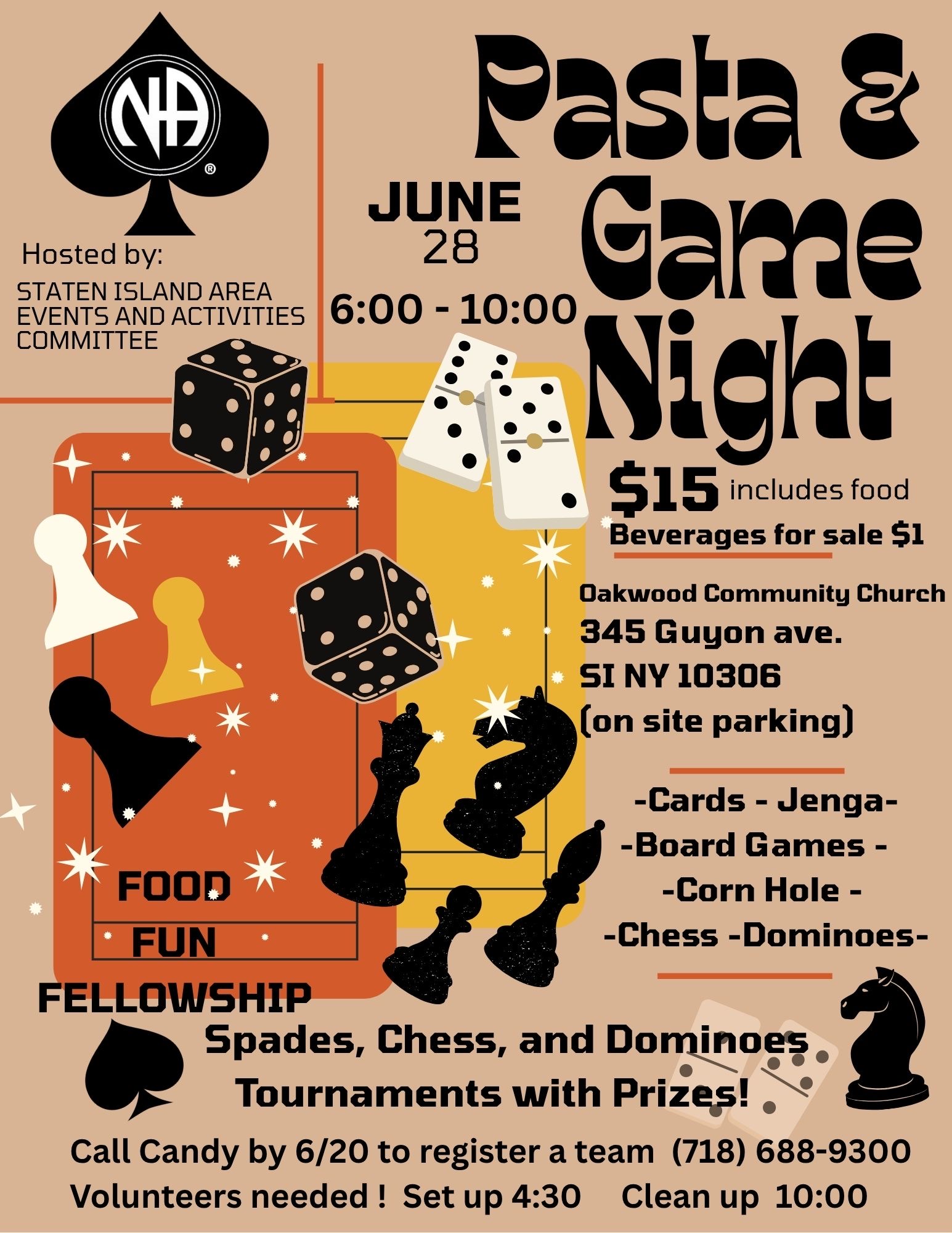 Click for flyer! Saturday, June 28th, 6:00 – 10:00pm Oakwood Community Church, 345 Guyon ave. SI NY 10306 (on site parking). Pasta & Game Night! Cards, Jenga, board games, chess, […]