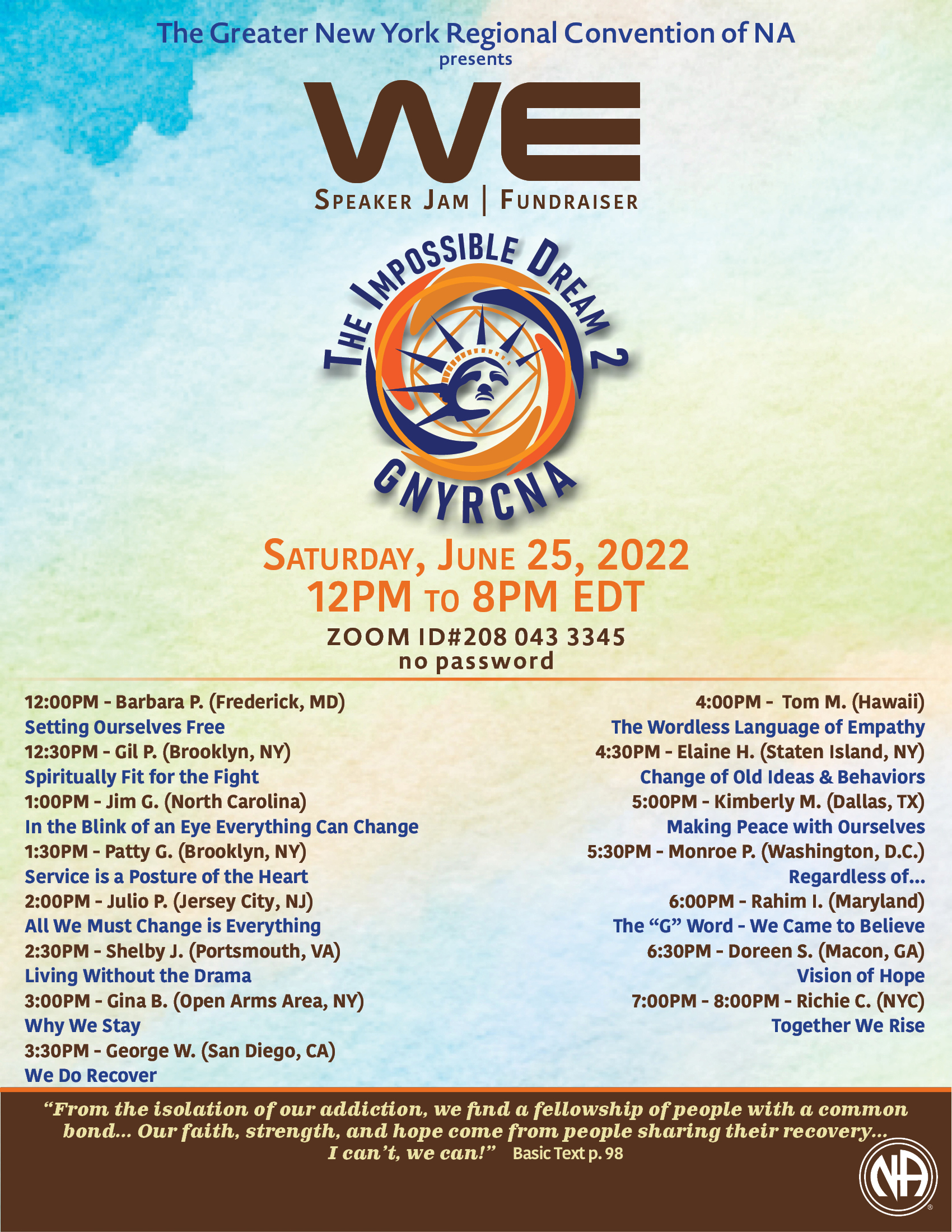 Saturday, June 25, 2022. 12pm to 8pm EDT. Zoom ID 208 043 3345, no password.