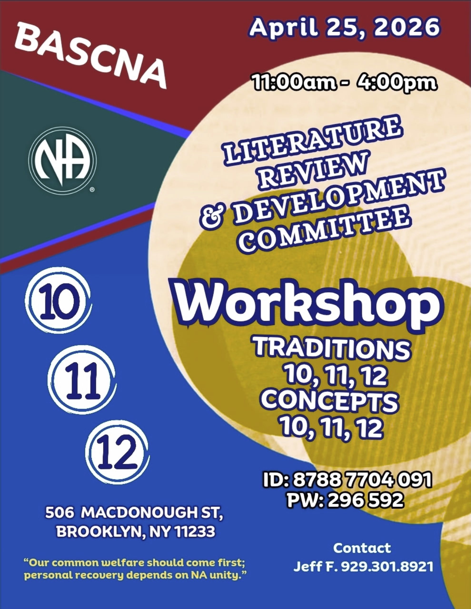 This is a hybrid event. Workshop will review Traditions 10,11 &12 & Concepts 10, 11 &12. Virtual ID 8788 7704 091 PW 296 592. Information: Contact Jeff F. 929-301-8921 See attached flier
