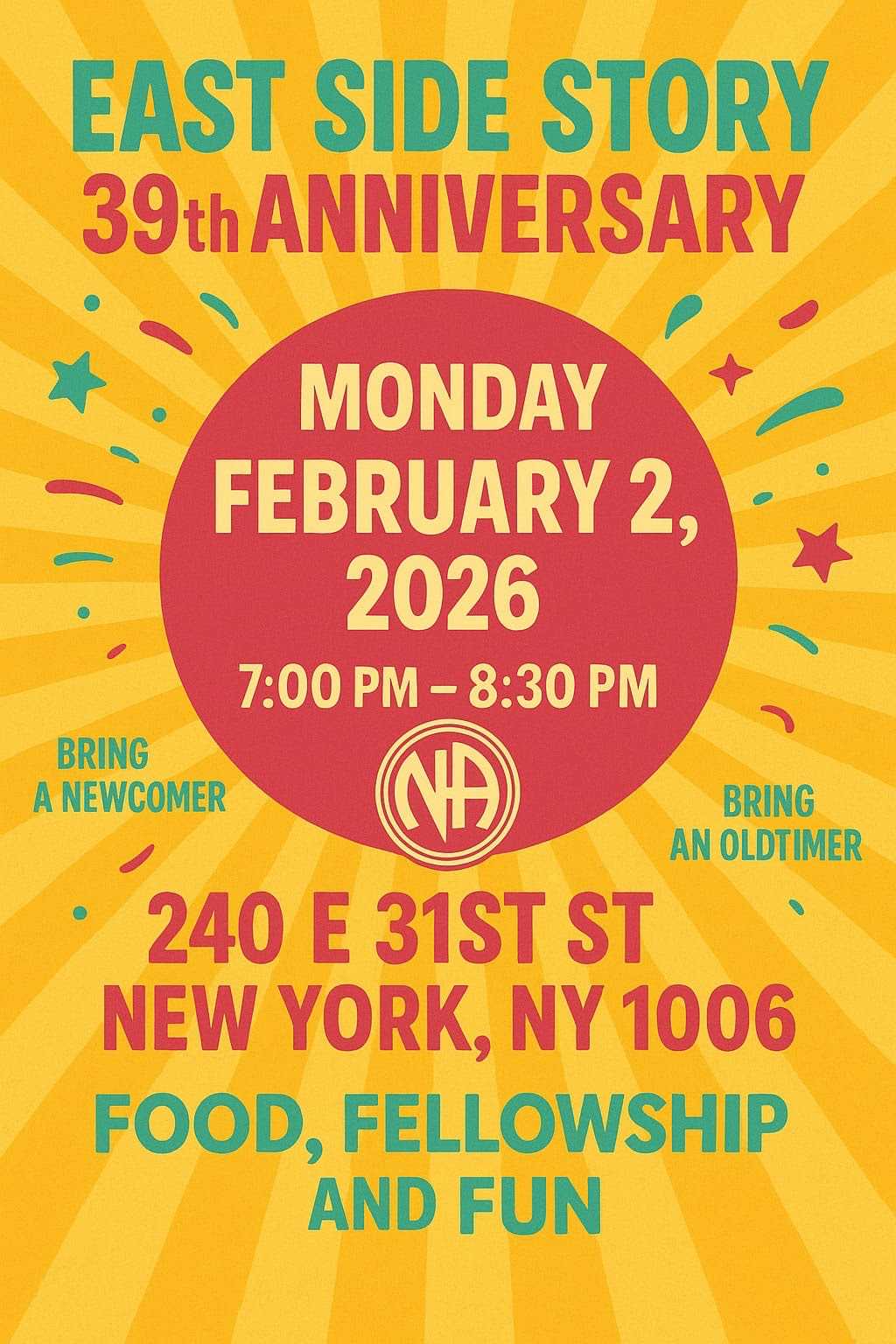 Eastside Story, 240 E 31st St, New York, NY 10016. 39th Anniversary! Food, fun and fellowship. Bring a newcomer, bring an old timer! See attached flier.