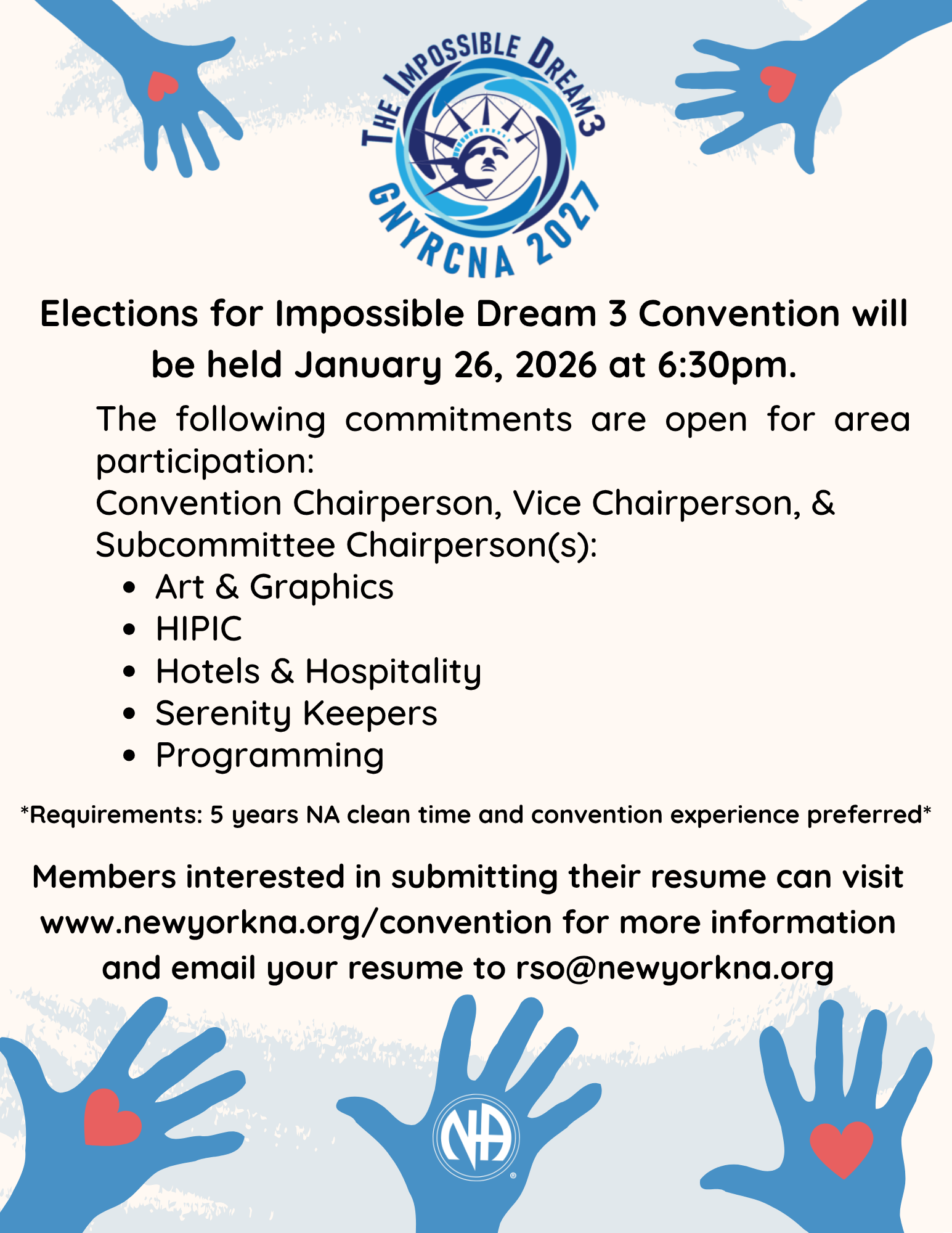 Elections for: Convention Chair, Convention Vice Chair, and Sub Committee(s) Chair: Art and Graphics, HIPIC, Hotels and Hospitality, Serenity Keepers and Programing. Requirements are 5 years NA clean time and […]