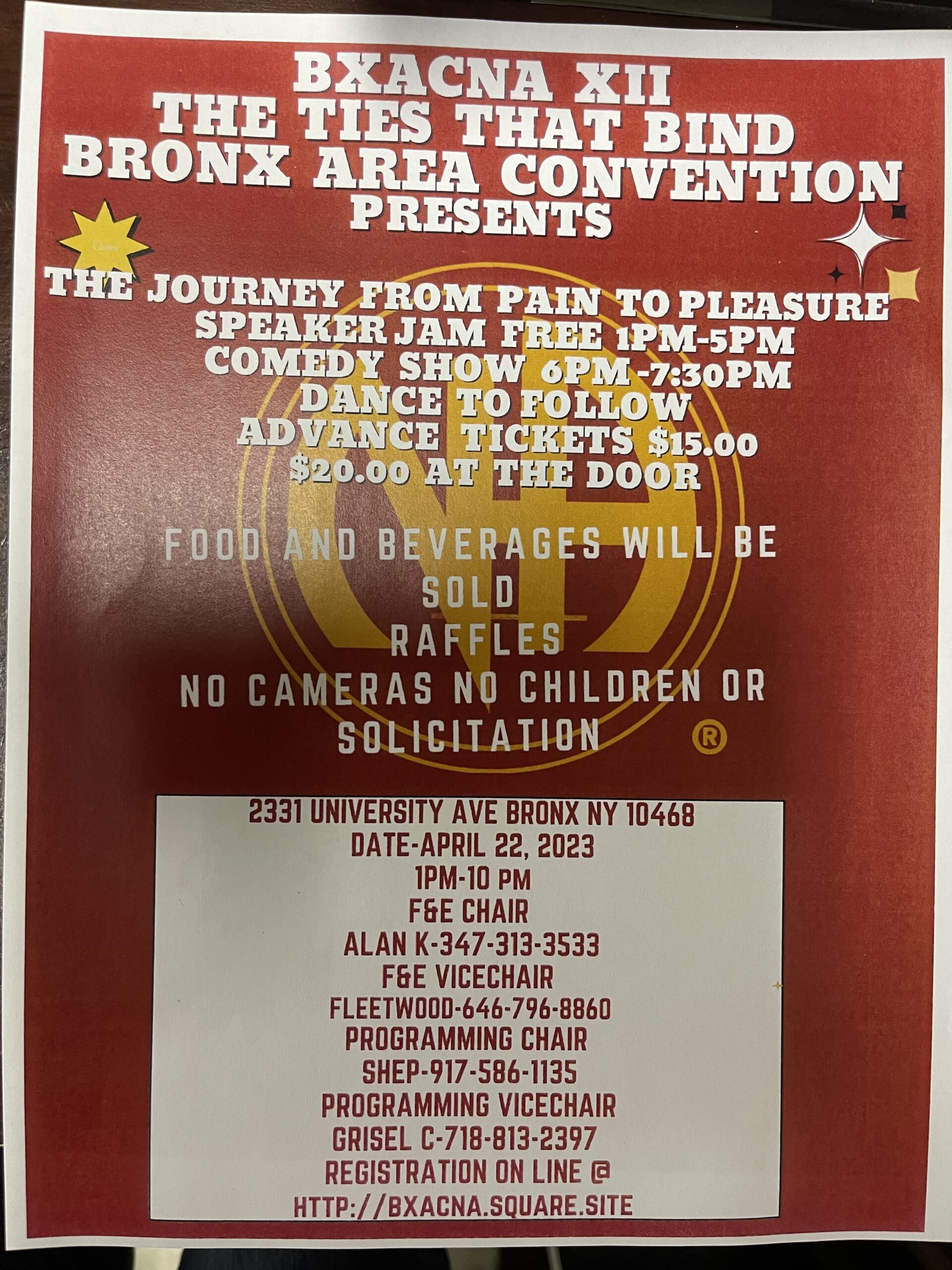 Staten Island Area Unity Through Service and GSR Learning Day Click for flier! April 8th, 2023. 11:00am – 4:00pm at 345 Guyon Avenue, SINY 10306. Speakers, presentations, Q and A. Bring a newcomer! Info: Don 848 210 7232